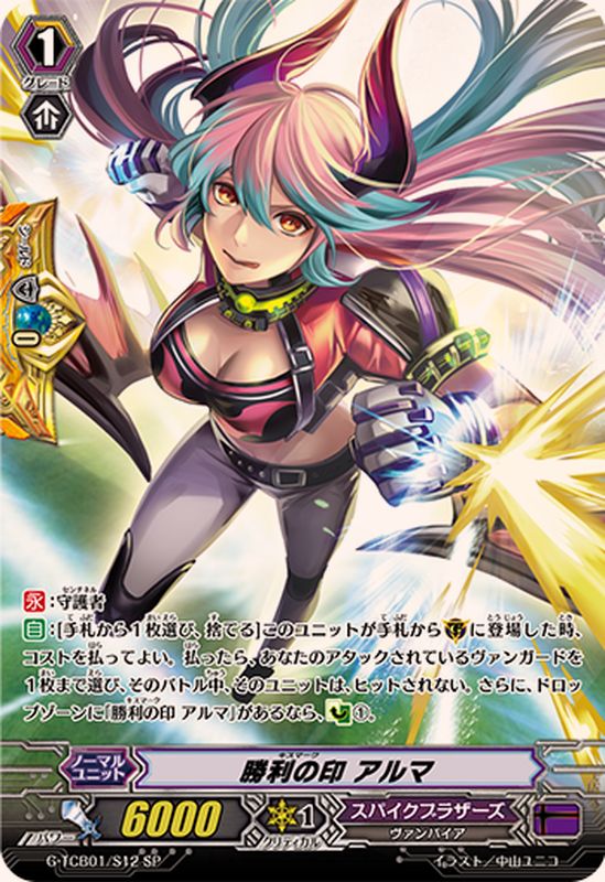 【永】:守護者【自】:[手札から1枚選び、捨てる]このユニットが手札から(G)に登場した時、コストを払ってよい。払ったら、あなたのアタックされているヴァンガードを1枚まで選び、そのバトル中、そのユニットは、ヒットされない。さらに、ドロップゾーンに「勝利の印 アルマ」があるなら、【カウンターチャージ】(1)。