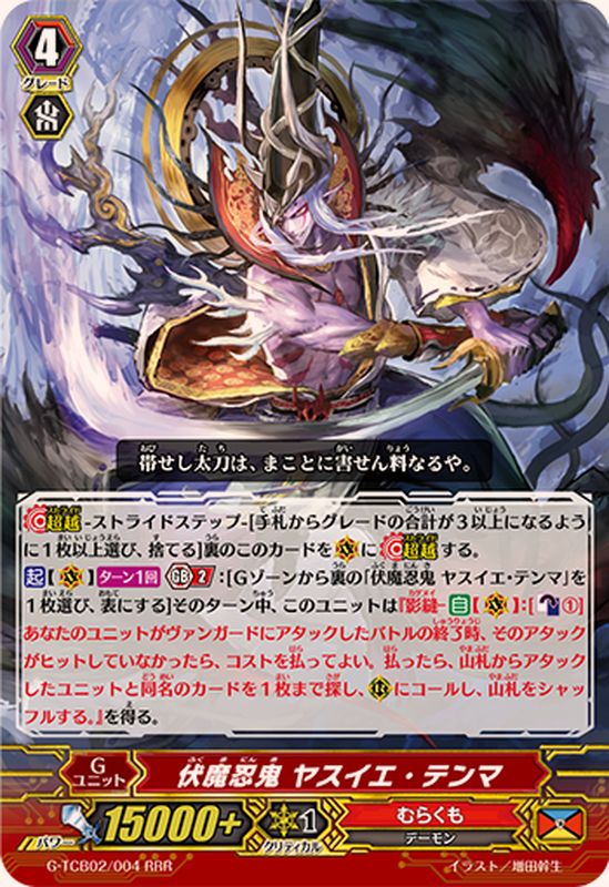 【超越】-ストライドステップ-[手札からグレードの合計が3以上になるように1枚以上選び、捨てる]裏のこのカードを(V)に【超越】する。【起】【(V)】【ターン1回】【Gブレイク】(2):[Gゾーンから裏の「伏魔忍鬼 ヤスイエ・テンマ」を1枚選び、表にする]そのターン中、このユニットは『影縫-【自】【(V)】:[【カウンターブラスト】(1)]あなたのユニットがヴァンガードにアタックしたバトルの終了時、そのアタックがヒットしていなかったら、コストを払ってよい。払ったら、山札からアタックしたユニットと同名のカードを1枚まで探し、(R)にコールし、山札をシャッフルする。』を得る。