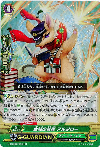 【Gガーディアン】(お互いのヴァンガードがグレード3以上で、あなたのGゾーンの表のGガーディアンが3枚以下なら使える)-相手ターンのガードステップ-[手札から【治】を1枚選び、捨てる]裏のこのカードを(G)にコールする。【自】:このユニットが(G)に登場した時、あなたのリアガードを好きな枚数選び、退却させ、あなたの、ユニットのいない(R)が3つ以上あるなら、そのバトル中、このユニットのシールド+10000。
