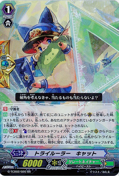【永】:守護者【自】:[手札から1枚選び、捨てる]このユニットが手札から(G)に登場した時、コストを払ってよい。払ったら、あなたのアタックされているヴァンガードを1枚選び、そのバトル中、そのユニットは、ヒットされない。【自】【Gブレイク】(1):[【カウンターブラスト】(1)]あなたのエンドフェイズ中、このユニットが(R)からドロップゾーンに置かれた時、コストを払ってよい。払ったら、山札から「トライルーラー・キャット」を1枚まで探し、相手に見せ、手札に加え、山札をシャッフルする。