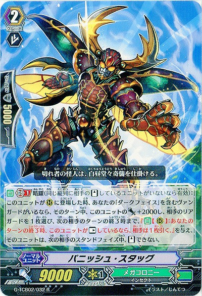【自】【Gブレイク】(1)暗躍(同じ縦列に相手の【スタンド】しているユニットがいないなら有効):このユニットが(R)に登場した時、あなたの「ダークフェイス」を含むヴァンガードがいるなら、そのターン中、このユニットのパワー+2000し、相手のリアガードを1枚選び、次の相手のターンの終了時まで、『【自】【(R)】:あなたのターンの終了時、このユニットが【レスト】しているなら、相手は1枚引く。』を与え、そのユニットは、次の相手のスタンドフェイズ中、【スタンド】できない。