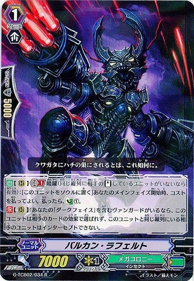 【自】【(R)】【Gブレイク】(1)暗躍(同じ縦列に相手の【スタンド】しているユニットがいないなら有効):[このユニットをソウルに置く]あなたのメインフェイズ開始時、コストを払ってよい。払ったら、【カウンターチャージ】(1)。【永】【(R)】:あなたの「ダークフェイス」を含むヴァンガードがいるなら、このユニットは相手のカードの効果で選ばれず、このユニットと同じ縦列にいる相手のユニットはインターセプトできない。