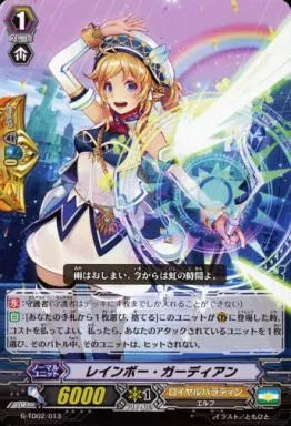 【永】:守護者(守護者はデッキに4枚までしか入れることができない)【自】:[あなたの手札から1枚選び、捨てる]このユニットが(G)に登場した時、コストを払ってよい。払ったら、あなたのアタックされているユニットを1枚選び、そのバトル中、そのユニットは、ヒットされない。