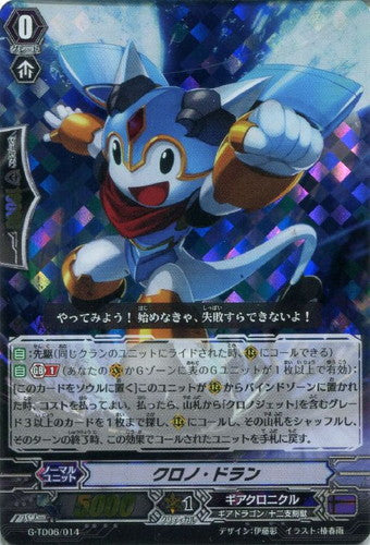 【自】:先駆(同じクランのユニットにライドされた時、(R)にコールできる)【自】【Gブレイク】(1)(あなたの(V)かGゾーンに表のGユニットが1枚以上で有効):[このカードをソウルに置く]このユニットが(R)からバインドゾーンに置かれた時、コストを払ってよい。払ったら、山札から「クロノジェット」を含むグレード3以上のカードを1枚まで探し、(R)にコールし、その山札をシャッフルし、そのターンの終了時、この効果でコールされたユニットを手札に戻す。