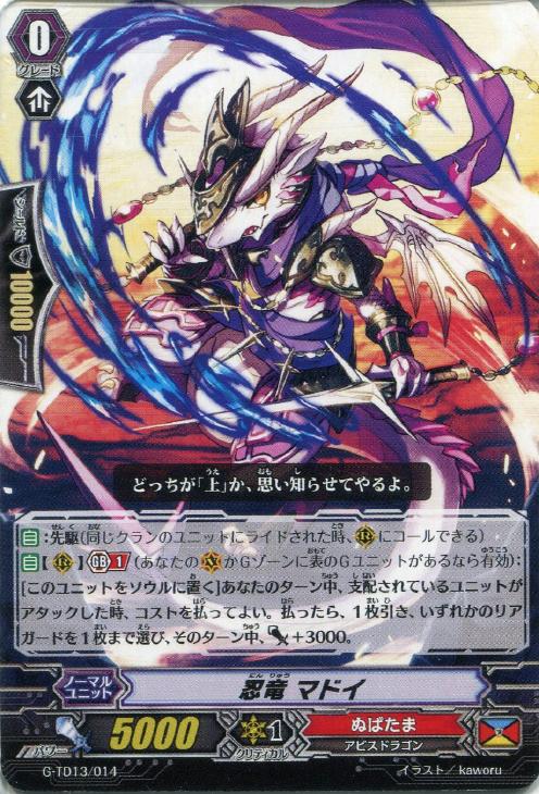 【自】:先駆(同じクランのユニットにライドされた時、(R)にコールできる)【自】【(R)】【Gブレイク】(1)(あなたの(V)かGゾーンに表のGユニットがあるなら有効):[このユニットをソウルに置く]あなたのターン中、支配されているユニットがアタックした時、コストを払ってよい。払ったら、1枚引き、いずれかのリアガードを1枚まで選び、そのターン中、パワー+3000。