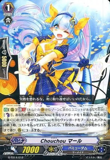 【自】【(R)】【Gブレイク】(1)(あなたの(V)かGゾーンに表のGユニットがあるなら有効):[【カウンターブラスト】(1),あなたの他の「Chouchou」を含むリアガードを1枚選び、山札の下に置く]このユニットが「Chouchou」を含むヴァンガードをブーストしたバトルの終了時、コストを払ってよい。払ったら、1枚引き、あなたの手札から1枚まで選び、(R)にコールする。