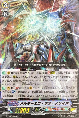 【自】【(V)】:あなたの〈メサイア〉のGユニットが【超越】した時、手札から1枚まで選び、(R)にコールし、すべてのファイターのリアガードをそれぞれ1枚まで選び、呪縛する。【自】【(V)】【Gブレイク】(2):[【ソウルブラスト】(1)]あなたのターンの終了時、あなたのカードの効果で、そのターンに呪縛カードを解呪していたら、コストを払ってよい。払ったら、2枚引く。