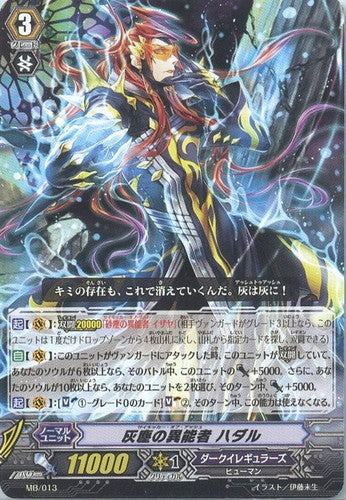 【起】【(V)】:【双闘20000】「砂塵の異能者 イザヤ」(相手ヴァンガードがグレード3以上なら、このユニットは1度だけドロップゾーンから4枚山札に戻し、山札から指定カードを探し、双闘できる)【自】【(V)】:このユニットがヴァンガードにアタックした時、このユニットが【双闘】していて、あなたのソウルが6枚以上なら、そのバトル中、このユニットのパワー+5000。さらに、あなたのソウルが10枚以上なら、あなたのユニットを2枚選び、そのターン中、パワー+5000。【起】【(V)】:[【ソウルブラスト】(1)-グレード0のカード]【ソウルチャージ】(2)。そのターン中、この能力は使えなくなる。