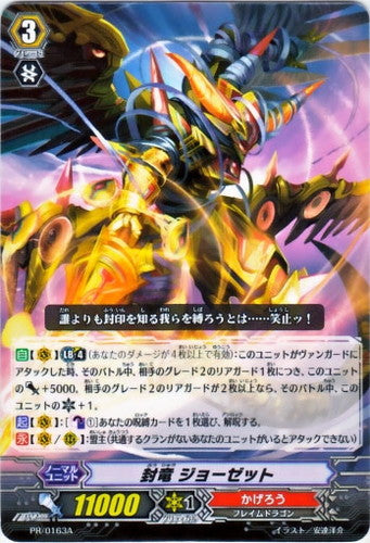 【自】【(V)】【リミットブレイク】(4)(あなたのダメージが4枚以上で有効):このユニットがヴァンガードにアタックした時、そのバトル中、相手のグレード2のリアガード1枚につき、このユニットのパワー+5000。相手のグレード2のリアガードが2枚以上なら、そのバトル中、このユニットのクリティカル+1。【起】【(V)】:[【カウンターブラスト】(1)]あなたの呪縛カードを1枚選び、解呪する。【永】【(V)/(R)】:盟主(共通するクランがないあなたのユニットがいるとアタックできない)