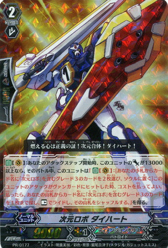 【自】【(V)】:あなたのアタックステップ開始時、このユニットのパワーが13000以上なら、そのバトル中、このユニットは『【自】【(V)】:[あなたの手札からカード名に「次元ロボ」を含むグレード3のカードを2枚選び、ソウルに置く]このユニットのアタックがヴァンガードにヒットした時、コストを払ってよい。払ったら、あなたの山札からカード名に「次元ロボ」を含むグレード3のカードを1枚まで探し、【レスト】でライドし、その山札をシャッフルする。』を得る。