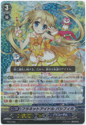 【自】【リミットブレイク】(4)(あなたのダメージが4枚以上で有効):《バミューダ△》がこのユニットにライドした時、あなたのヴァンガードを1枚選び、そのターン中、パワー+10000し、『【自】【(V)】:あなたの《バミューダ△》が(R)から手札に戻された時、あなたの山札から《バミューダ△》を1枚まで探し、(R)にコールし、その山札をシャッフルする。そのターン中、この能力は使えなくなる。』を与える。【起】【ソウル】:[【カウンターブラスト】(1),あなたの(R)から「トップアイドル パシフィカ」を1枚選び、ソウルに置く]このカードを手札に加え、あなたの《バミューダ△》のリアガードを1枚まで選び、手札に戻す。【永】【(V)/(R)】:盟主(共通するクランがないあなたのユニットがいるとアタックできない)
