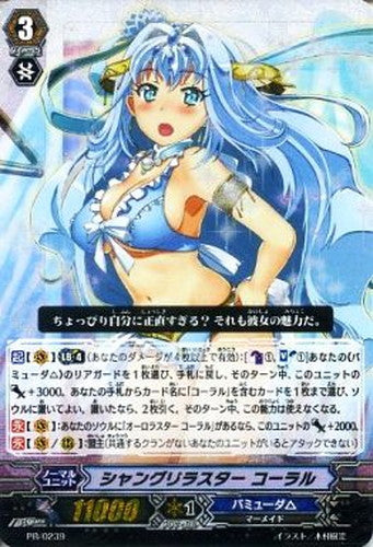 【起】【(V)】【リミットブレイク】(4)(あなたのダメージが4枚以上で有効):[【カウンターブラスト】(1),【ソウルブラスト】(1)]あなたの《バミューダ△》のリアガードを1枚選び、手札に戻し、そのターン中、このユニットのパワー+3000。あなたの手札からカード名に「コーラル」を含むカードを1枚まで選び、ソウルに置いてよい。置いたなら、2枚引く。そのターン中、この能力は使えなくなる。【永】【(V)】:あなたのソウルに「オーロラスター コーラル」があるなら、このユニットのパワー+2000。【永】【(V)/(R)】:盟主(共通するクランがないあなたのユニットがいるとアタックできない)