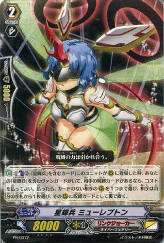 【自】:[【カウンターブラスト】(2)-「星輝兵」を含むカード]このユニットが(R)に登場した時、あなたの「星輝兵」を含むヴァンガードがいて、相手の呪縛カードがあるなら、コストを払ってよい。払ったら、カードのない相手の(R)を1つまで選び、相手は自分の手札から1枚選び、その(R)に呪縛カードとして裏で置く。
