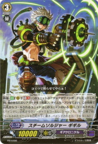 時翔-【自】【(R)】【Gブレイク】(1):このユニットのアタックがヴァンガードにヒットした時、他のあなたのリアガードを1枚選び、タイムリープさせてよい。この効果で山札からコールされるユニットはこのユニットのいる(R)にしかコールできない。(バインドし、山札からグレード+1をコールし、シャッフル。ターン終了時、コールされたユニットを山札の下に置き、バインドされたカードをコール)