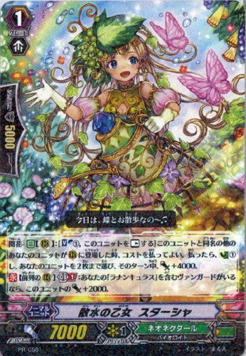 開花-【自】【(R)】:[【ソウルブラスト】(1),このユニットを【レスト】する]このユニットと同名の他のあなたのユニットが(R)に登場した時、コストを払ってよい。払ったら、【カウンターチャージ】(1)し、あなたのユニットを2枚まで選び、そのターン中、パワー+4000。【永】【前列の(R)】【Gブレイク】(1):あなたの「ラナンキュラス」を含むヴァンガードがいるなら、このユニットのパワー+2000。