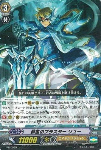 【自】:このユニットが(V)か(R)に登場した時、あなたのドロップゾーンから「ブラスター・ブレード」を含むカードを1枚選び、山札の下に置いてよい。置いたら、そのターン中、このユニットのパワー+5000。【永】【(R)/(G)】:あなたの、「アルフレッド」か「ブラスター」を含むヴァンガードがいるなら、このユニットのシールド+5000し、『インターセプト』を得る。