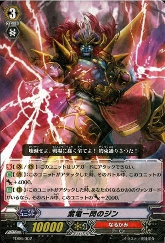 【永】【(V)/(R)】:このユニットはリアガードにアタックできない。【自】【(V)】:このユニットがアタックした時、そのバトル中、このユニットのパワー+4000。【自】【(R)】:このユニットがアタックした時、あなたの《なるかみ》のヴァンガードがいるなら、そのバトル中、このユニットのパワー+2000。
