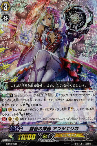 【自】【リミットブレイク】(4)(あなたのダメージが4枚以上で有効):[【ソウルブラスト】(3)]《ジェネシス》がこのユニットにライドした時、コストを払ってよい。払ったら、2枚引き、あなたのヴァンガードを1枚選び、そのターン中、パワー+10000。【自】【(V)】:このユニットがヴァンガードにアタックした時、【ソウルチャージ】(1)し、そのバトル中、このユニットのパワー+1000。【永】【(V)/(R)】:盟主(共通するクランがないあなたのユニットがいるとアタックできない)