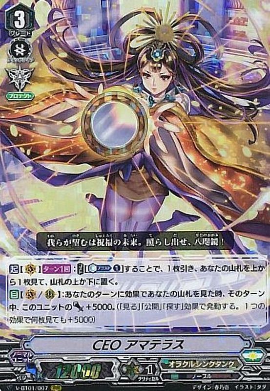 【起】【(V)】【ターン1回】:【コスト】[【カウンターブラスト】(1)]することで、1枚引き、あなたの山札を上から1枚見て、山札の上か下に置く。【自】【(V)/(R)】:あなたのターンに効果であなたの山札を見た時、そのターン中、このユニットのパワー+5000。(「見る」「公開」「探す」効果で発動する。1つの効果で何枚見ても+5000)