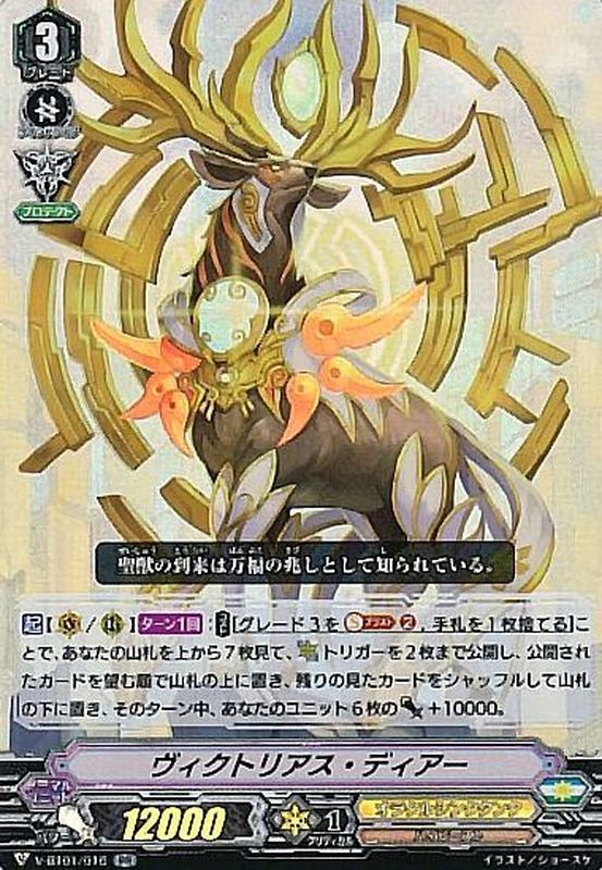 【起】【(V)/(R)】【ターン1回】:【コスト】[グレード3を【ソウルブラスト】(2),手札を1枚捨てる]ことで、あなたの山札を上から7枚見て、【クリティカル】トリガーを2枚まで公開し、公開されたカードを望む順で山札の上に置き、残りの見たカードをシャッフルして山札の下に置き、そのターン中、あなたのユニット6枚のパワー+10000。