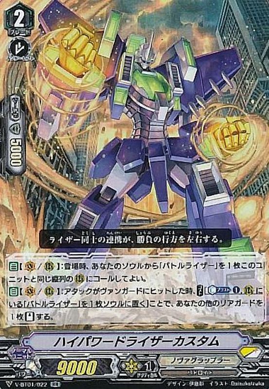 【自】【(V)/(R)】:登場時、あなたのソウルから「バトルライザー」を1枚このユニットと同じ縦列の(R)にコールしてよい。【自】【(V)/(R)】:アタックがヴァンガードにヒットした時、【コスト】[【カウンターブラスト】(1),(R)にいる「バトルライザー」を1枚ソウルに置く]ことで、あなたの他のリアガードを1枚【スタンド】する。