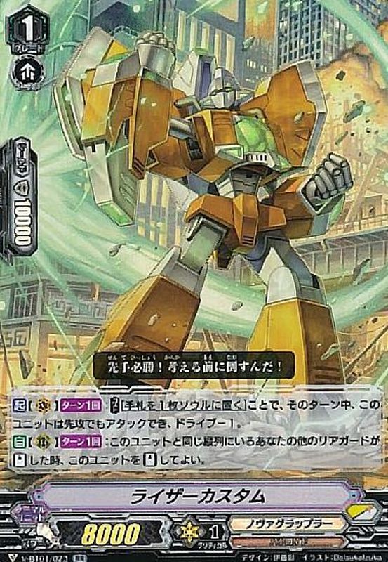 【起】【(V)】【ターン1回】:【コスト】[手札を1枚ソウルに置く]ことで、そのターン中、このユニットは先攻でもアタックでき、ドライブ-1。【自】【(R)】【ターン1回】:このユニットと同じ縦列にいるあなたの他のリアガードが【スタンド】した時、このユニットを【スタンド】してよい。
