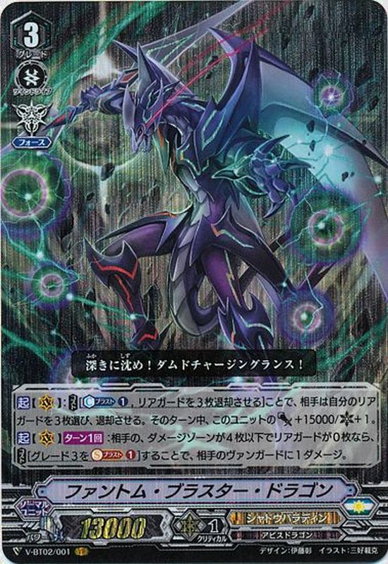 【起】【(V)】:【コスト】[【カウンターブラスト】(1),リアガードを3枚退却させる]ことで、相手は自分のリアガードを3枚選び、退却させる。そのターン中、このユニットのパワー+15000/クリティカル+1。【起】【(V)】【ターン1回】:相手の、ダメージゾーンが4枚以下でリアガードが0枚なら、【コスト】[グレード3を【ソウルブラスト】(1)]することで、相手のヴァンガードに1ダメージ。