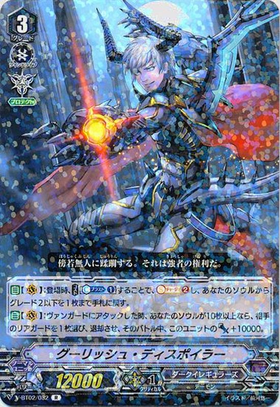 【自】【(V)】:登場時、【コスト】[【カウンターブラスト】(1)]することで、【ソウルチャージ】(2)し、あなたのソウルからグレード2以下を1枚まで手札に戻す。【自】【(V)】:ヴァンガードにアタックした時、あなたのソウルが10枚以上なら、相手のリアガードを1枚選び、退却させ、そのバトル中、このユニットのパワー+10000。