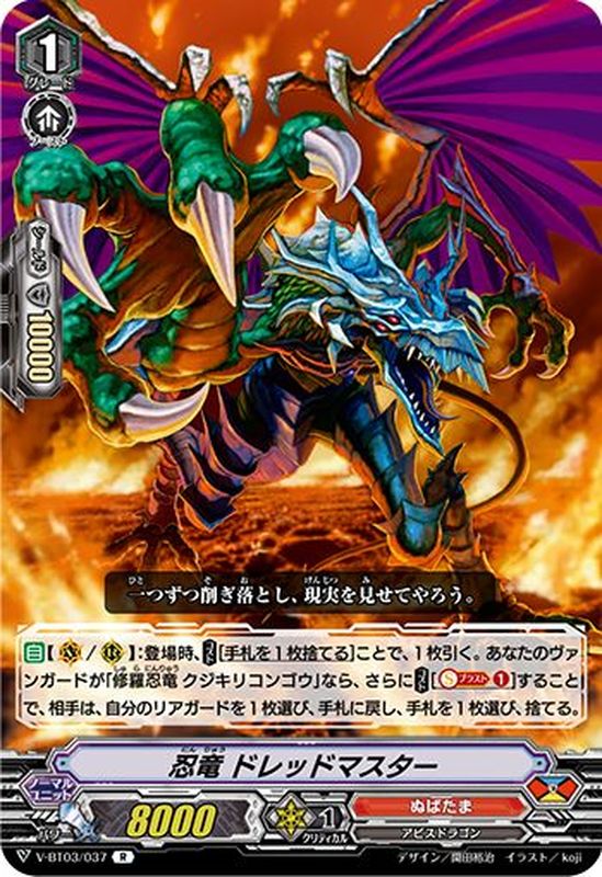 【自】【(V)/(R)】:登場時、【コスト】[手札を1枚捨てる]ことで、1枚引く。あなたのヴァンガードが「修羅忍竜 クジキリコンゴウ」なら、さらに【コスト】[【ソウルブラスト】(1)]することで、相手は、自分のリアガードを1枚選び、手札に戻し、手札を1枚選び、捨てる。