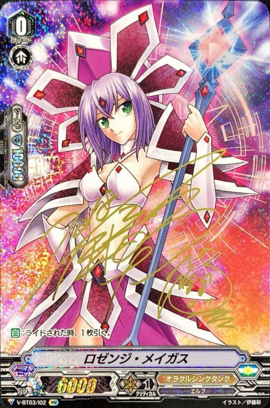 【自】:ライドされた時、1枚引く。さらに、相手のヴァンガードがグレード1以上なら、あなたはクイックシールド・チケットを1枚手札に加える。