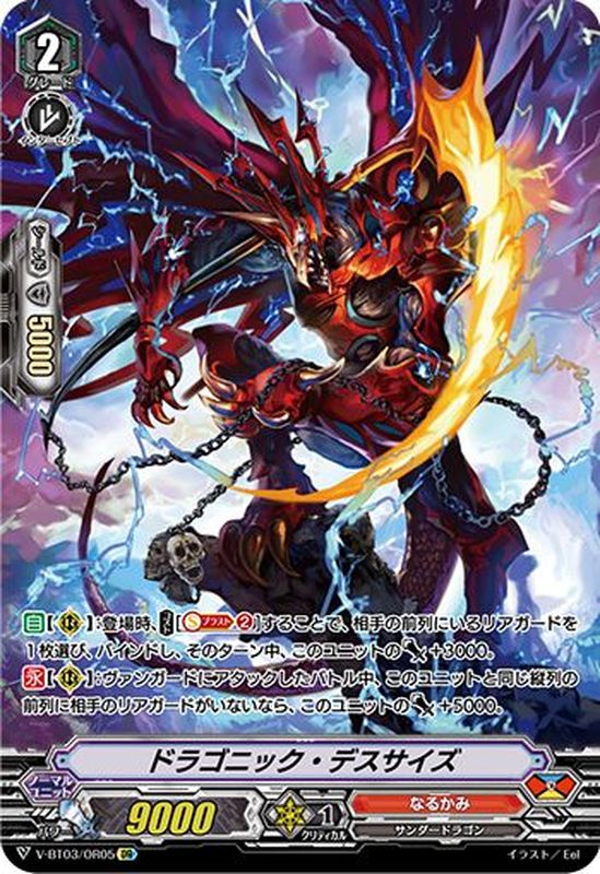 【自】【(R)】:登場時、【コスト】[【ソウルブラスト】(2)]することで、相手の前列にいるリアガードを1枚選び、バインドし、そのターン中、このユニットのパワー+3000。【永】【(R)】:このユニットと同じ縦列の前列に相手のリアガードがいないなら、このユニットのパワー+3000。