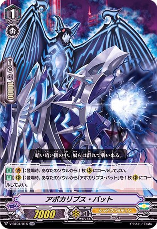 【自】【(V)】:登場時、あなたのソウルから1枚(R)にコールしてよい。【自】【(R)】:登場時、あなたのソウルから「アポカリプス・バット」を1枚(R)にコールしてよい。