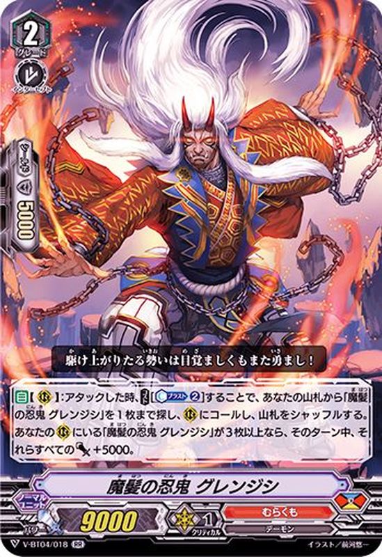 【自】【(R)】:アタックした時、【コスト】[【カウンターブラスト】(2)」することで、あなたの山札から「魔髪の忍鬼 グレンジシ」を1枚まで探し、(R)にコールし、山札をシャッフルする。あなたの(R)にいる「魔髪の忍鬼 グレンジシ」が3枚以上なら、そのターン中、それらすべてのパワー+5000。