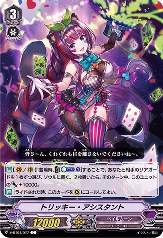 【自】【(V)/(R)】:登場時、【コスト】[【カウンターブラスト】(1)]することで、あなたと相手のリアガードを1枚ずつ選び、ソウルに置く。2枚置いたら、そのターン中、このユニットのパワー+10000。【自】:ライドされた時、このカードを(R)にコールしてよい。
