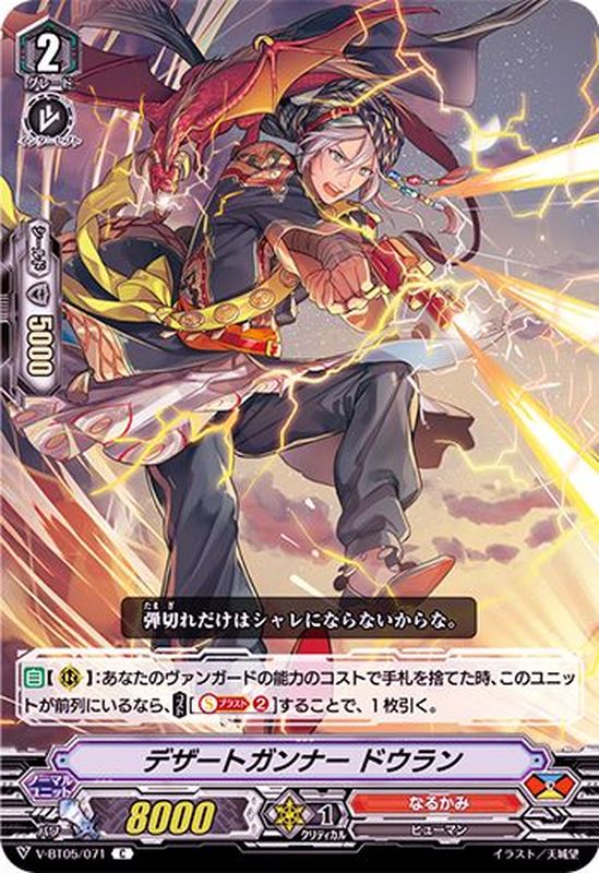 【自】【(R)】:あなたのヴァンガードの能力のコストで手札を捨てた時、このユニットが前列にいるなら、【コスト】[【ソウルブラスト】(2)]することで、1枚引く。