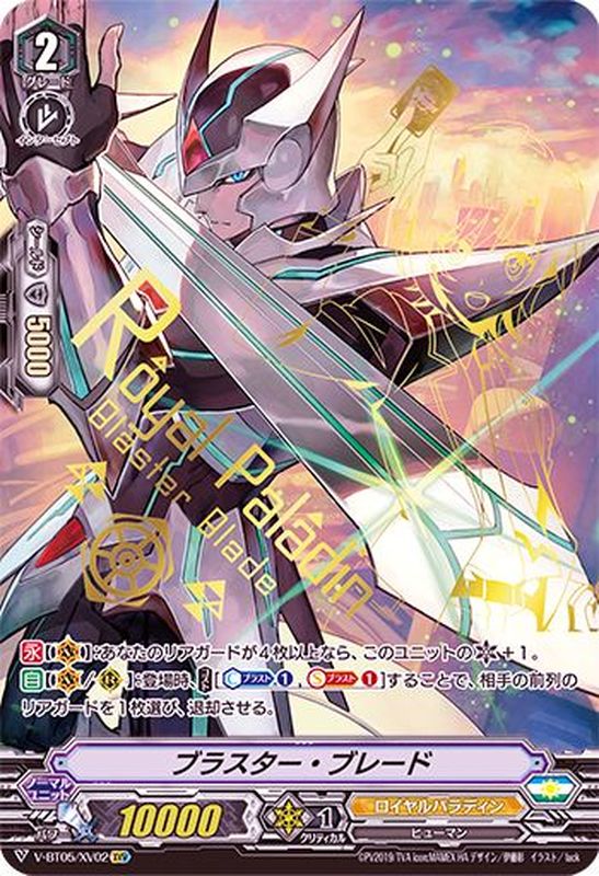 【永】【(V)】:あなたのリアガードが4枚以上なら、このユニットのクリティカル+1。【自】【(V)/(R)】:登場時、【コスト】[【カウンターブラスト】(1),【ソウルブラスト】(1)]することで、相手の前列のリアガードを1枚選び、退却させる。