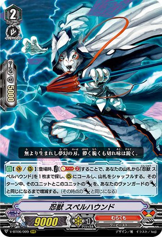 【自】【(V)/(R)】:登場時、【コスト】[【ソウルブラスト】(2)]することで、あなたの山札から「忍獣 スペルハウンド」を1枚まで探し、(R)にコールし、山札をシャッフルする。そのターン中、そのユニットとこのユニットのパワーを、あなたのヴァンガードのパワーと同じになるまで増減する。(その時点のパワーと同じになる)