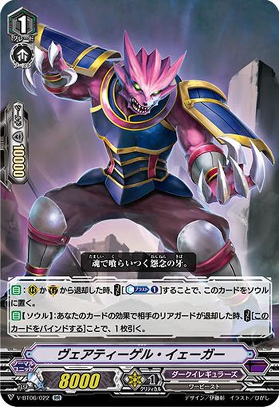 【自】:(R)か(G)から退却した時、【コスト】[【カウンターブラスト】(1)]することで、このカードをソウルに置く。【自】【ソウル】:あなたのカードの効果で相手のリアガードが退却した時、【コスト】[このカードをバインドする]ことで、1枚引く。