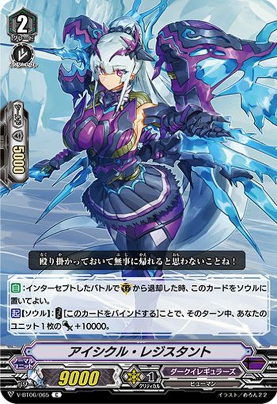 【自】:インターセプトしたバトルで(G)から退却した時、このカードをソウルに置いてよい。【起】【ソウル】:【コスト】[このカードをバインドする]ことで、そのターン中、あなたのユニット1枚のパワー+10000。
