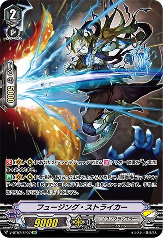 【永】【(V)/(R)】:あなたのドライブチェックで出る【前】トリガー効果のパワー増加を+5000する。【自】【(V)/(R)】:登場時、あなたの山札を上から5枚見て、「闘拳竜 ゴッドハンド・ドラゴン」を1枚まで公開して手札に加え、山札をシャッフルする。手札に加えたら、あなたの手札を1枚捨てる。