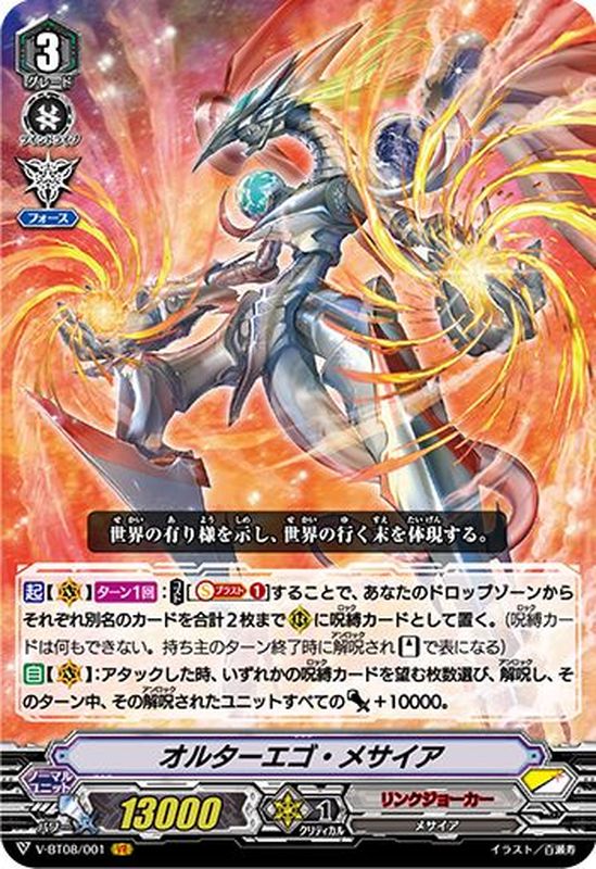 【起】【(V)】【ターン1回】:【コスト】[【ソウルブラスト】(1)]することで、あなたのドロップゾーンからそれぞれ別名のカードを合計2枚まで(R)に呪縛カードとして置く。(呪縛カードは何もできない。持ち主のターン終了時に解呪され【スタンド】で表になる)【自】【(V)】:アタックした時、いずれかの呪縛カードを望む枚数選び、解呪し、そのターン中、その解呪されたユニットすべてのパワー+10000。