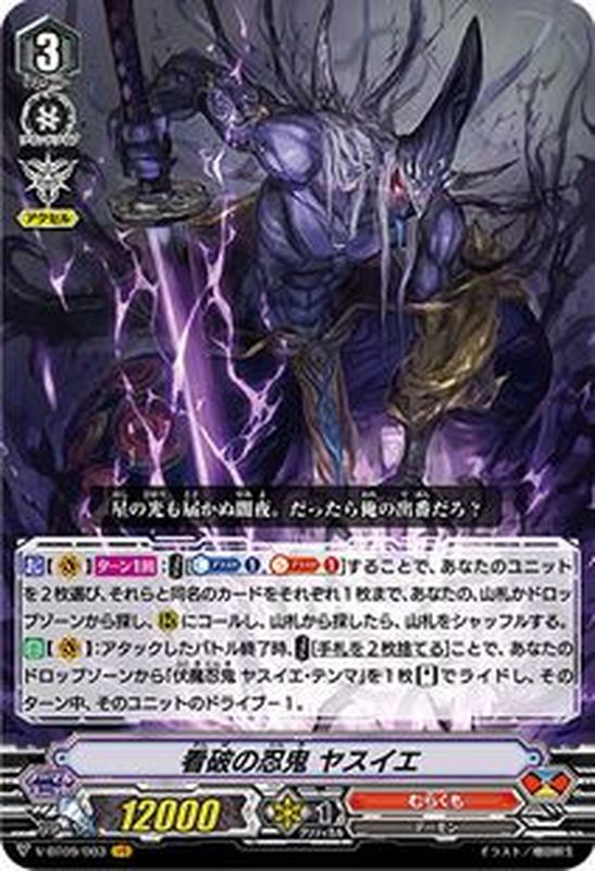 【起】【(V)】【ターン1回】:【コスト】[【カウンターブラスト】(1),【ソウルブラスト】(1)]することで、あなたのユニットを2枚選び、それらと同名のカードをそれぞれ1枚まで、あなたの、山札かドロップゾーンから探し、(R)にコールし、山札から探したら、山札をシャッフルする。【自】【(V)】:アタックしたバトル終了時、【コスト】[手札を2枚捨てる]ことで、あなたのドロップゾーンから「伏魔忍鬼 ヤスイエ・テンマ」を1枚【スタンド】でライドし、そのターン中、そのユニットのドライブ-1。