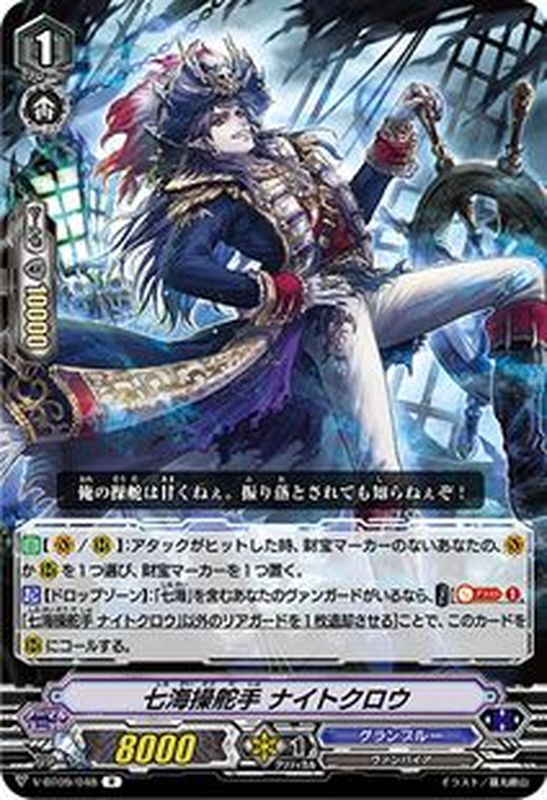 【自】【(V)/(R)】:アタックがヒットした時、財宝マーカーのないあなたの、(V)か(R)を1つ選び、財宝マーカーを1つ置く。【起】【ドロップゾーン】:「七海」を含むあなたのヴァンガードがいるなら、【コスト】[【ソウルブラスト】(1),「七海操舵手 ナイトクロウ」以外のリアガードを1枚退却させる]ことで、このカードを(R)にコールする。