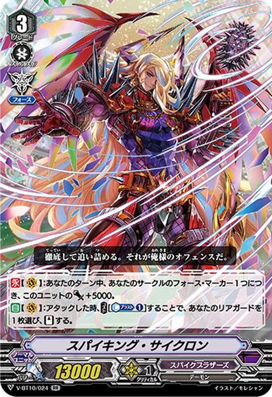 【永】【(V)】:あなたのターン中、あなたのサークルのフォース・マーカー1つにつき、このユニットのパワー+5000。【自】【(V)】:アタックした時、【コスト】[【カウンターブラスト】(1)]することで、あなたのリアガードを1枚選び、【スタンド】する。
