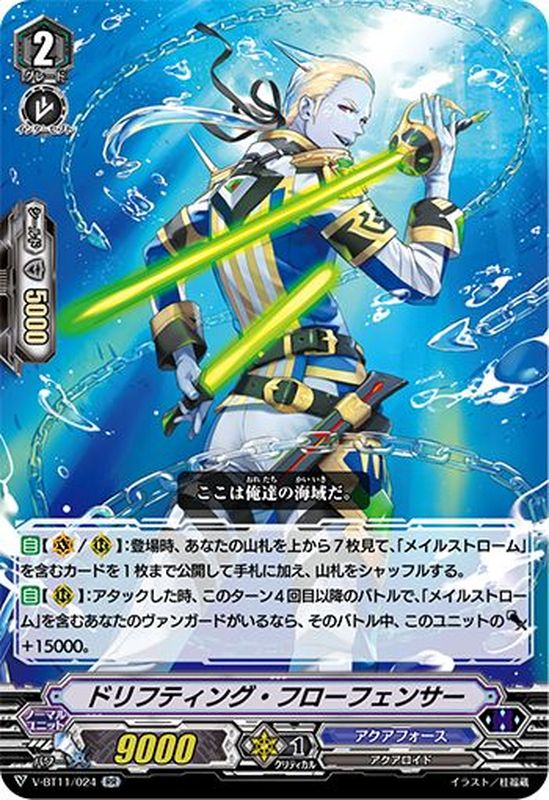 【自】【(V)/(R)】:登場時、あなたの山札を上から7枚見て、「メイルストローム」を含むカードを1枚まで公開して手札に加え、山札をシャッフルする。【自】【(R)】:アタックした時、このターン4回目以降のバトルで、「メイルストローム」を含むあなたのヴァンガードがいるなら、そのバトル中、このユニットのパワー+15000。