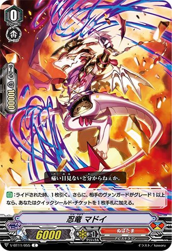 【自】:ライドされた時、1枚引く。さらに、相手のヴァンガードがグレード1以上なら、あなたはクイックシールド・チケットを1枚手札に加える。