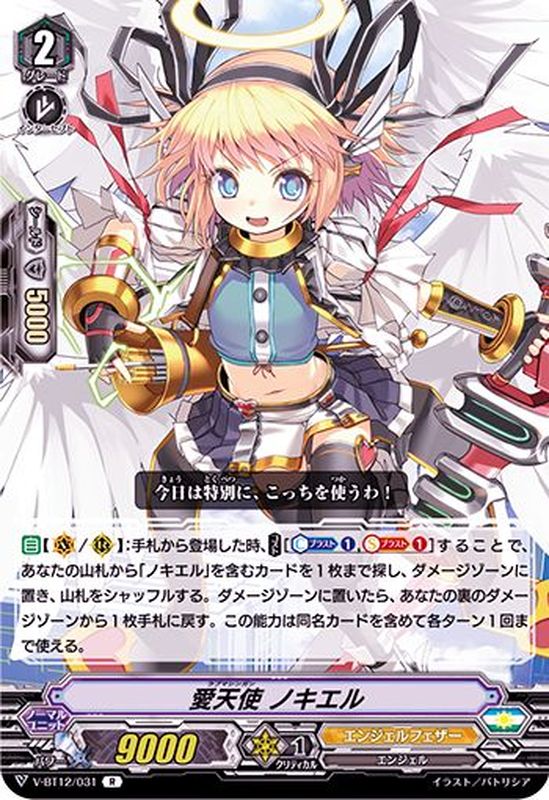 【自】【(V)/(R)】:手札から登場した時、【コスト】[【カウンターブラスト】(1),【ソウルブラスト】(1)]することで、あなたの山札から「ノキエル」を含むカードを1枚まで探し、ダメージゾーンに置き、山札をシャッフルする。ダメージゾーンに置いたら、あなたの裏のダメージゾーンから1枚手札に戻す。この能力は同名カードを含めて各ターン1回まで使える。