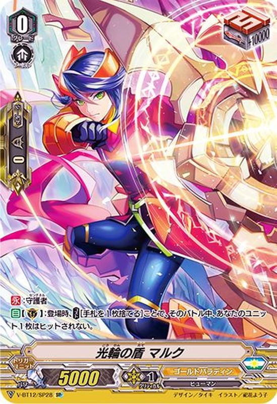 【永】:守護者【自】【(G)】:登場時、【コスト】[手札を1枚捨てる]ことで、そのバトル中、あなたのユニット1枚はヒットされない。