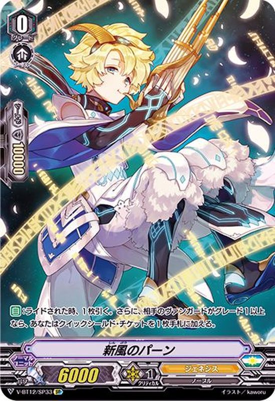 【自】:ライドされた時、1枚引く。さらに、相手のヴァンガードがグレード1以上なら、あなたはクイックシールド・チケットを1枚手札に加える。