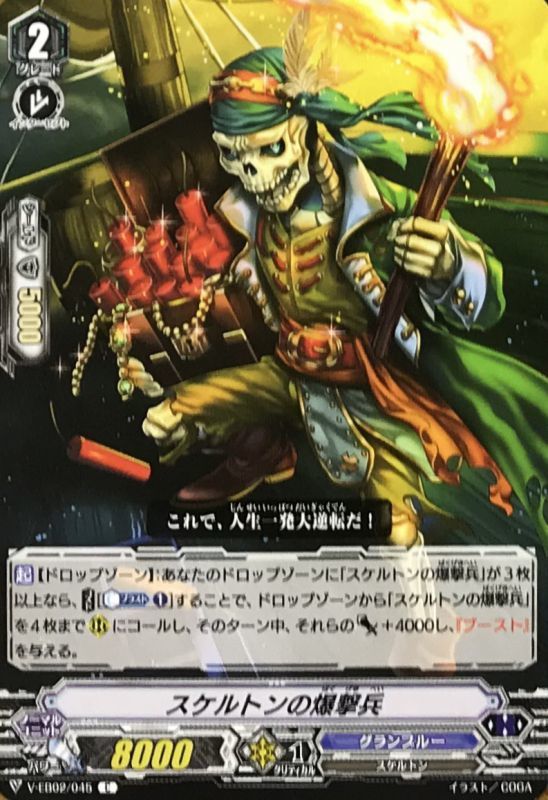 【起】【ドロップゾーン】:あなたのドロップゾーンに「スケルトンの爆撃兵」が3枚以上なら、【コスト】[【カウンターブラスト】(1)]することで、ドロップゾーンから「スケルトンの爆撃兵」を4枚まで(R)にコールし、そのターン中、それらのパワー+4000し、『ブースト』を与える。